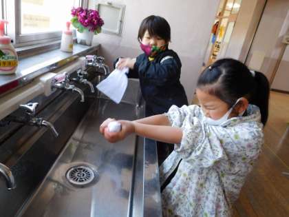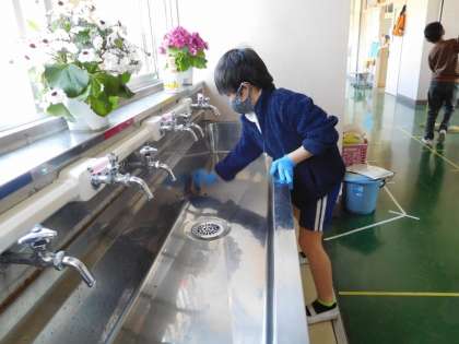 掃除の時間2 公開日 2021/04/14 更新日 2021/04/14 校長室から 2年生と5年生の掃除の様子です。この日は、ちょっと冷える日だったので、水が冷たいなとつぶやいていました。それでも、ぎゅっと絞ったり、黙々ときれいにしたりしていました。周りにも、自分の分担をしっかり掃除している子がたくさんいました。