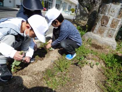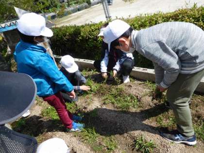 2・3・4組の子で、畑の草取りをしました。「根っこがぬけない!」と声が上がるほどしぶとい草もありました。でも、「おおきなかぶ」を思い出しながら、楽しく草を抜いていました。さて、このあとはどんな植物を植えるのでしょうか。楽しみです。