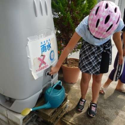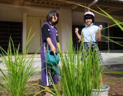 5年生の子が、バケツ稲の水やりに来ていました。