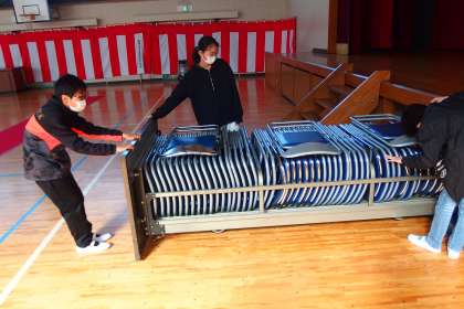 体育館で会場作りをする6年生。