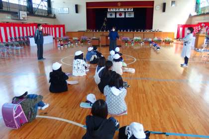 入学式の準備を終えて、校長先生のお礼の話を聞いている6年生です。