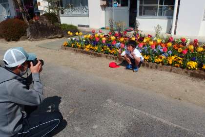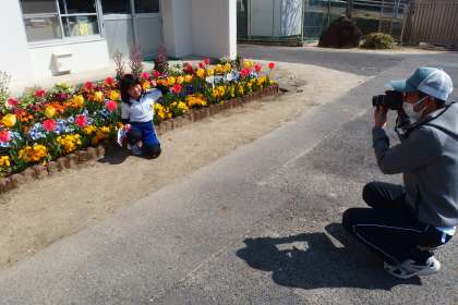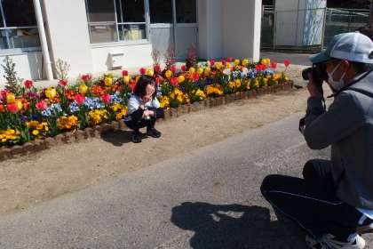 2年生がチューリップの前で個人写真を撮っていました。
