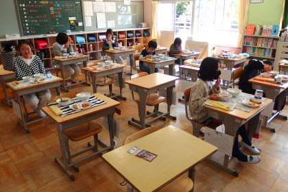 ここに写っていて先に食べている人たちは、給食の時間の後半に1年生のサポートに行ってくれます。