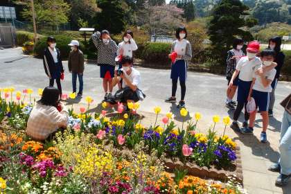 6年生が職員室前の花壇で個人写真を撮っていました。