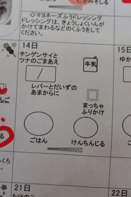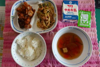 今日の給食の献立です。 抹茶ふりかけには、豊田市産の茶葉が使われています。