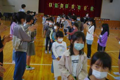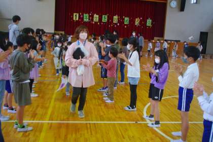 2年生〜6年生に見送られて、1年生が退場しているところです。