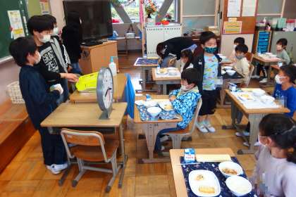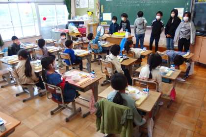 1年生の給食の配膳、片付けを6年生がサポートしてれています。