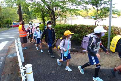 今朝の登校の様子です。 オレンジのベストは登校を見守る校長先生です。