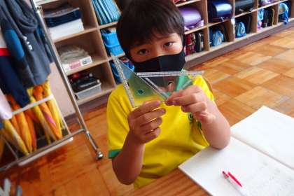 三角定規を2つ使って、指示された角度を表す組み合わせを考えていました。