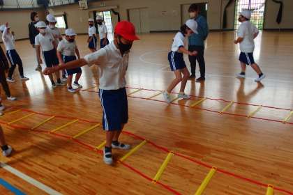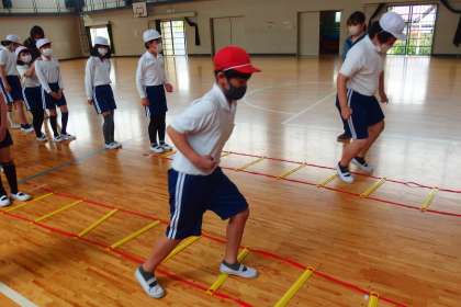 5年生の体育です。 ラダーを使って、基礎体力トレーニングをしていました。