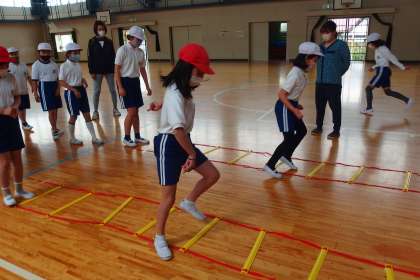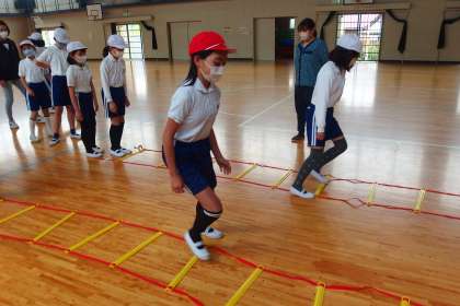 5年生の体育です。 ラダーを使って、基礎体力トレーニングをしていました。