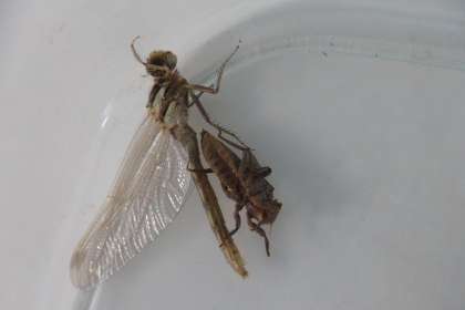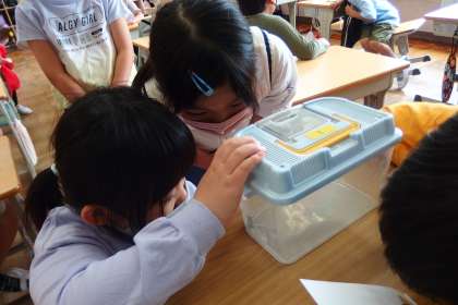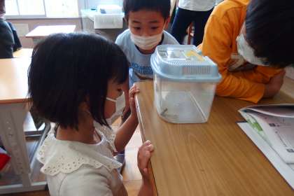 4月21日の東広瀬小学校(18) 公開日 2022/04/21 更新日 2022/04/21 活動の様子 3年生の子が羽化途中のトンボを見つけて、めずらしい場面(その子は何の場面がわからない)だったので、教室に持ってきて、担任の先生に聞いていました。 担任の先生が飼育ケースに入れて、みんなで観察しているところです。