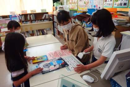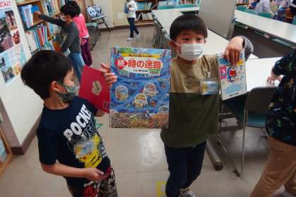 昼放課の図書室の様子です。 1年生の子たちが本を借りに来ていました。