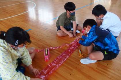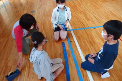 体育館で、1立方メートルがどのくらいの量になるのか、みんなで考えています。