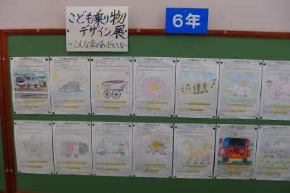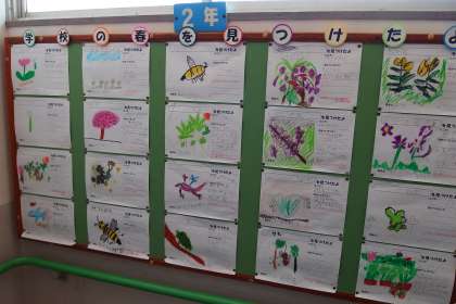 階段の踊り場に掲示している子どもたちの授業作品です。