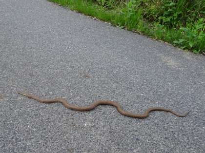 子どもたちを見送った帰り道に、こんなヘビが道路にゆうゆうととどまっていました。