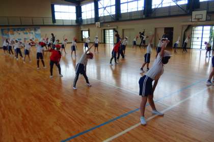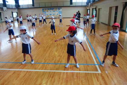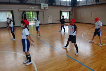 雨降りで運動場が使えないため、体育館で3年生と4年生が合同で体育をしていました。