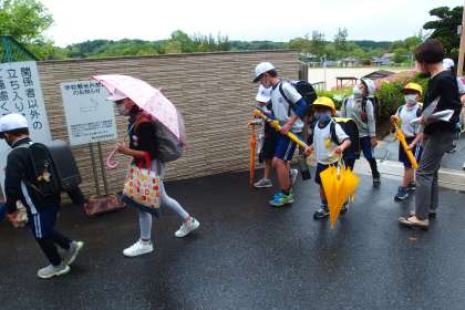 今日の下校風景です。 カサをさしている子が少なかったですが、細かい雨が降り続いていました。