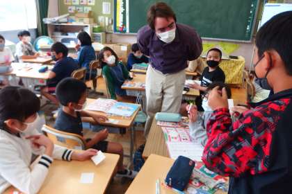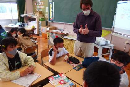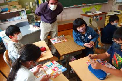 5年生の英語の授業です。 ALTの先生と英会話練習をしました。