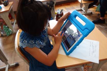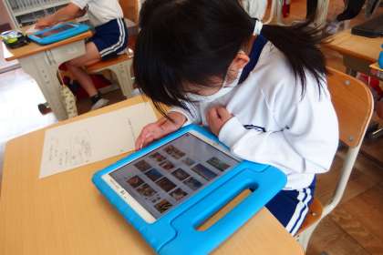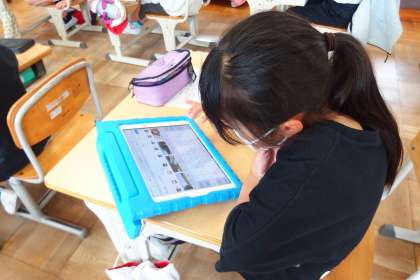 タブレットを使って調べ学習をする3年生。