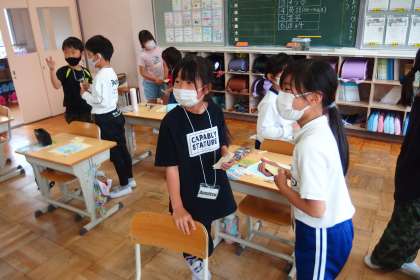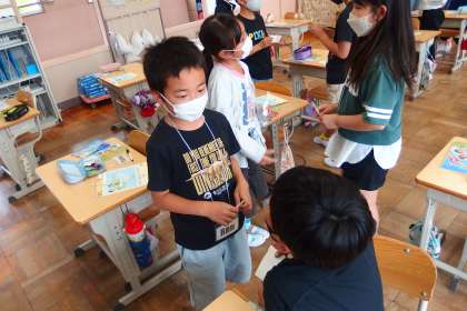 3年生の外国語活動の授業です。 名刺カードを作り、それを交換する英会話練習を行いました。