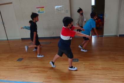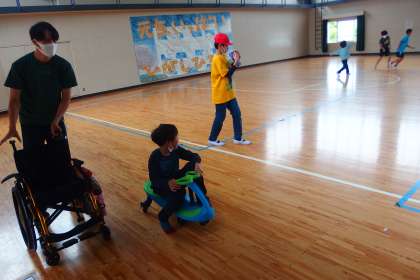 雨降りで運動場が使えないので、体育館に来ている子どもたちです。