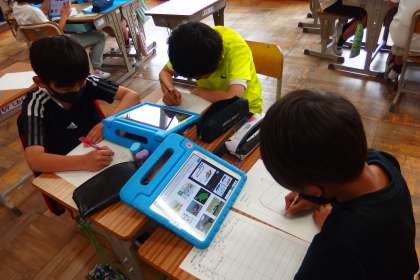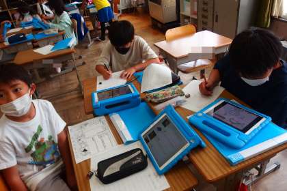 飼育し始めたクサガメのことで、一人ずつテーマを決めて、タブレットで調べ学習をしている4年生です。