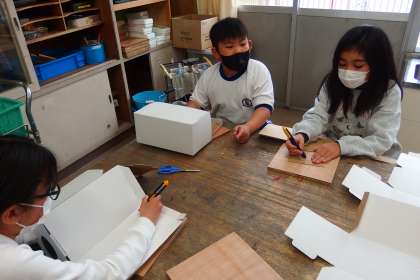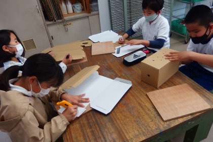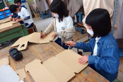 ダンボールを使って工作に取り組んでいます。