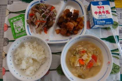 今日の給食のメニューです。 豊田市産の茶葉が使われているふりかけがつきました。