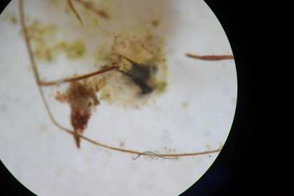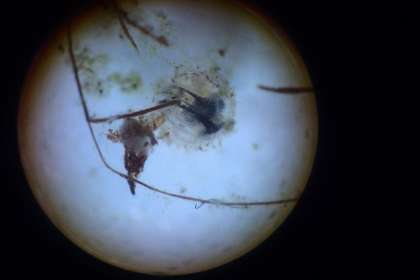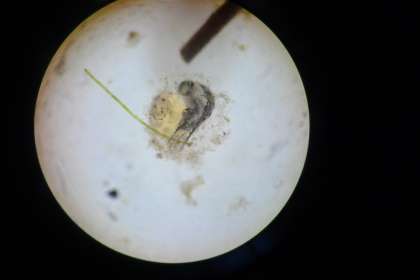 顕微鏡をのぞくと、メダカの卵がもうすぐ孵化する様子を観察できました。