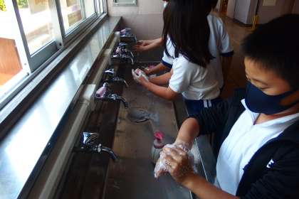 給食前に、せっけんをしっかりと泡立てて手洗いをする2年生です。