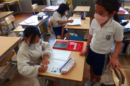 2年生の朝の会の前のひとこまです。