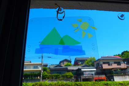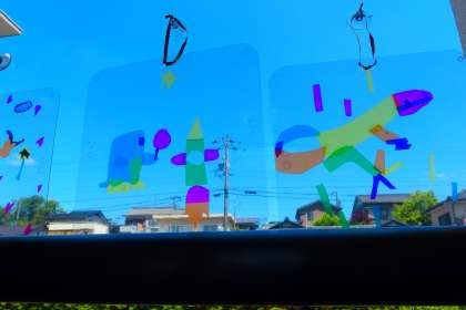 2年生の図工で作ったステンドグラスが窓に貼られていました。