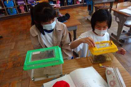 捕まえてきた生き物を観察する4年生。