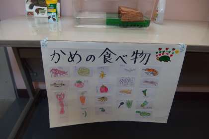 4年生がクラスで飼育しているクサガメの食べるものを、タブレットを使って自分たちで調べたようです。