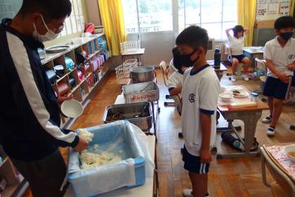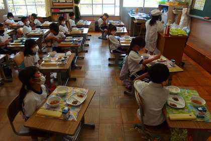 5月23日の東広瀬小学校(30) 公開日 2022/05/23 更新日 2022/05/23 活動の様子 上の写真は、2年生の配膳の様子です。 下の写真は、配膳が終わり、いただきますを今か今かと待っている1年生です。