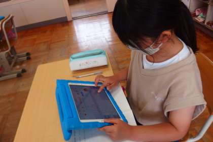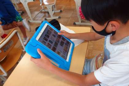 運動場で生き物の観察をした結果をタブレットでまとめをしていました。