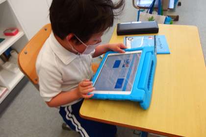 タブレットで健康観察のお試し入力をしています。
