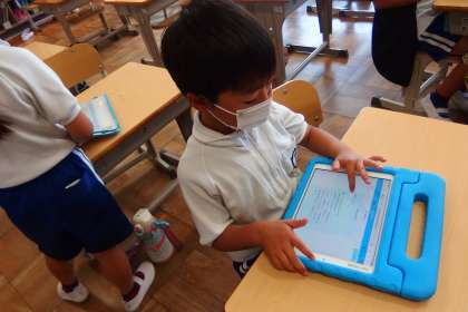 タブレットを使って健康観察のお試し入力をしている4年生です。