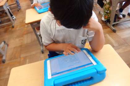 タブレットを使って健康観察のお試し入力をしている4年生です。