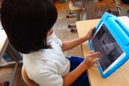 タブレットを使って健康観察のお試し入力をしている4年生です。