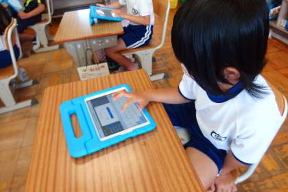 タブレットを使って健康観察のお試し入力をしている4年生です。