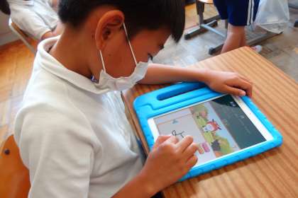 タブレットのアプリを使って、社会科の学習(都道府県)をしている3年生です。