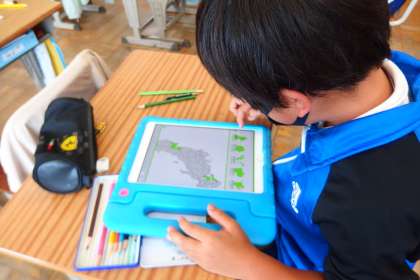 タブレットのアプリを使って、社会科の学習(都道府県)をしている3年生です。