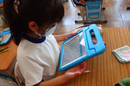 タブレットのアプリを使って、社会科の学習(都道府県)をしている3年生です。