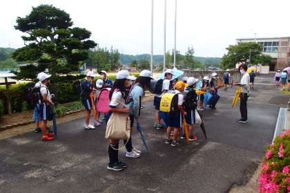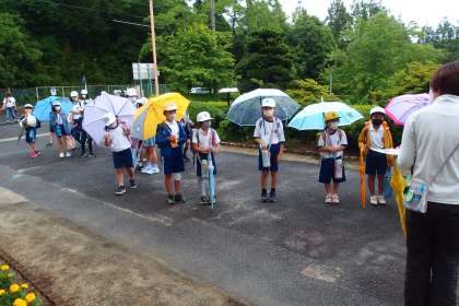 今朝の登校の様子です。 細かい霧雨の朝でした。 カラフルなカサの花が咲いていました。