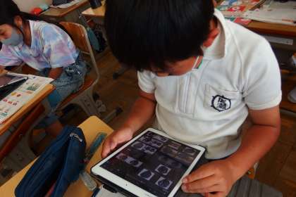 ALTとの会話練習に備えて、タブレットを参考にして自分の紹介文を考えています。