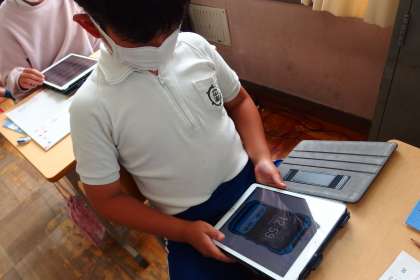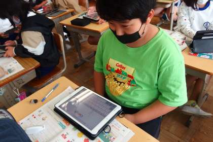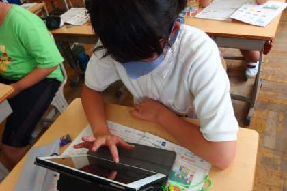 ALTとの会話練習に備えて、タブレットを参考にして自分の紹介文を考えています。