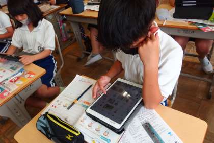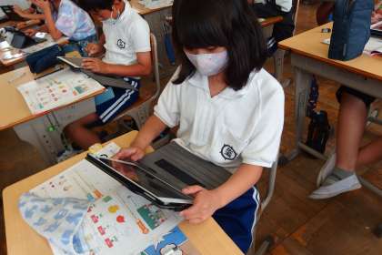 ALTとの会話練習に備えて、タブレットを参考にして自分の紹介文を考えています。