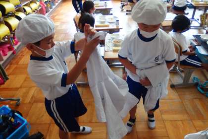 6月1日の東広瀬小学校(32) 公開日 2022/06/01 更新日 2022/06/01 活動の様子 上の写真は、給食の配膳の様子です。 下の写真は、配膳が終わって着替えをする1年生です。 着替えもずいぶんと早くできるようになってきました。